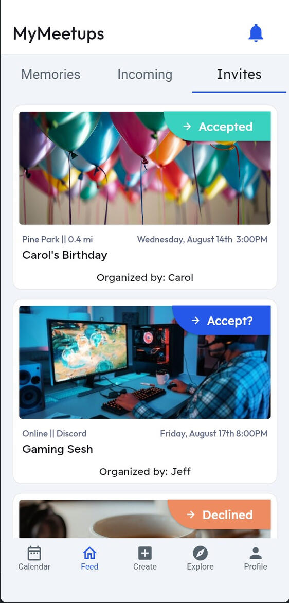 A prototype in Figma highlighting all the functionalities of the App. Create events. Engage in live event missions. Accept invitations and check memories. NOT THE FINAL DESIGN :D
